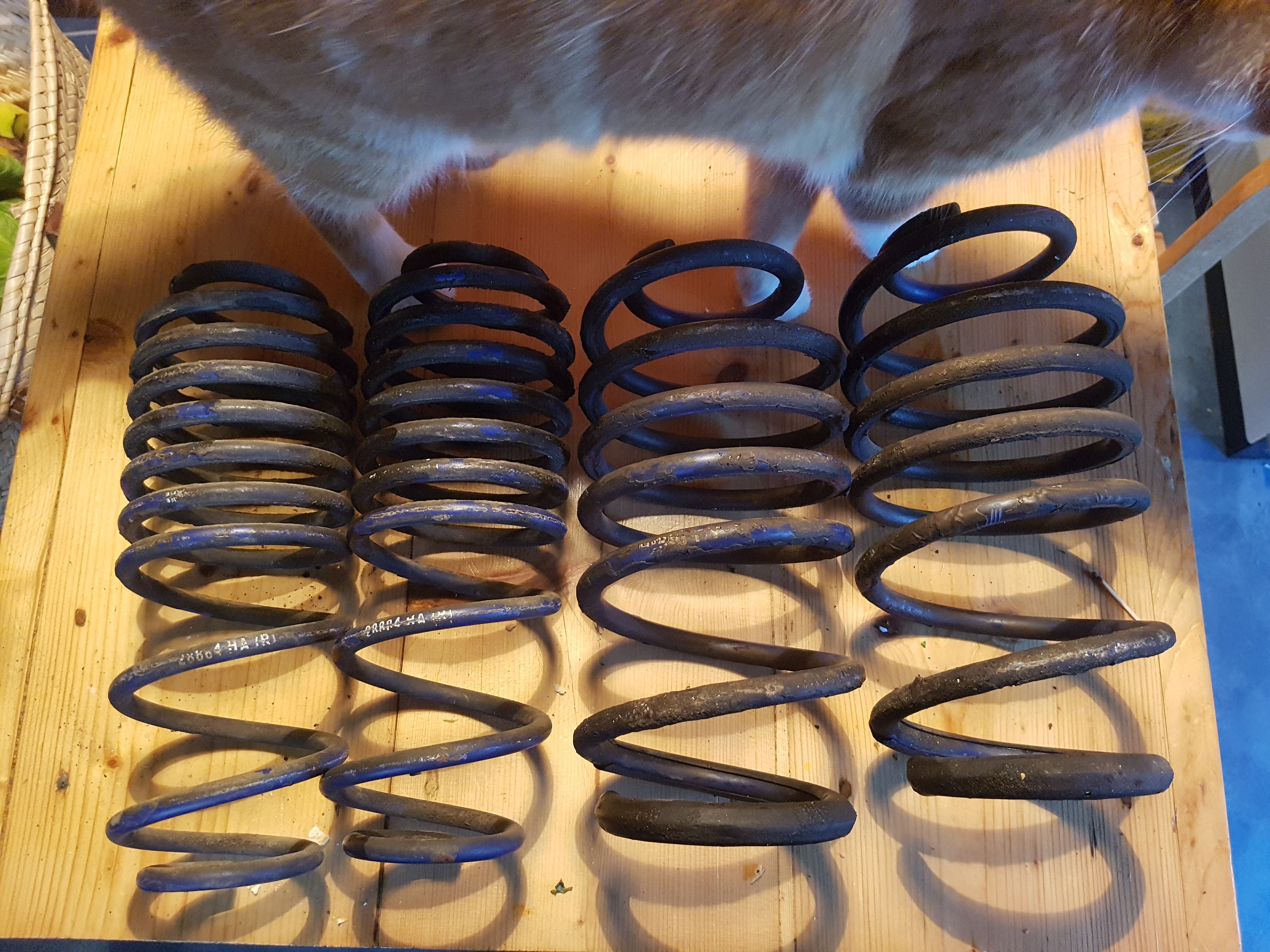 Veren hebben ongeveer 45.000 km onder de auto gezeten. De vorige eigenaar heeft direct na aankoop van de auto (nieuw) de auto verlaagd met dit setje en een Dinitrol (anti roest) behandeling gedaan. Vandaar het zwartje laagje dat te zien is op de foto. Veren zijn verder in prima staat.