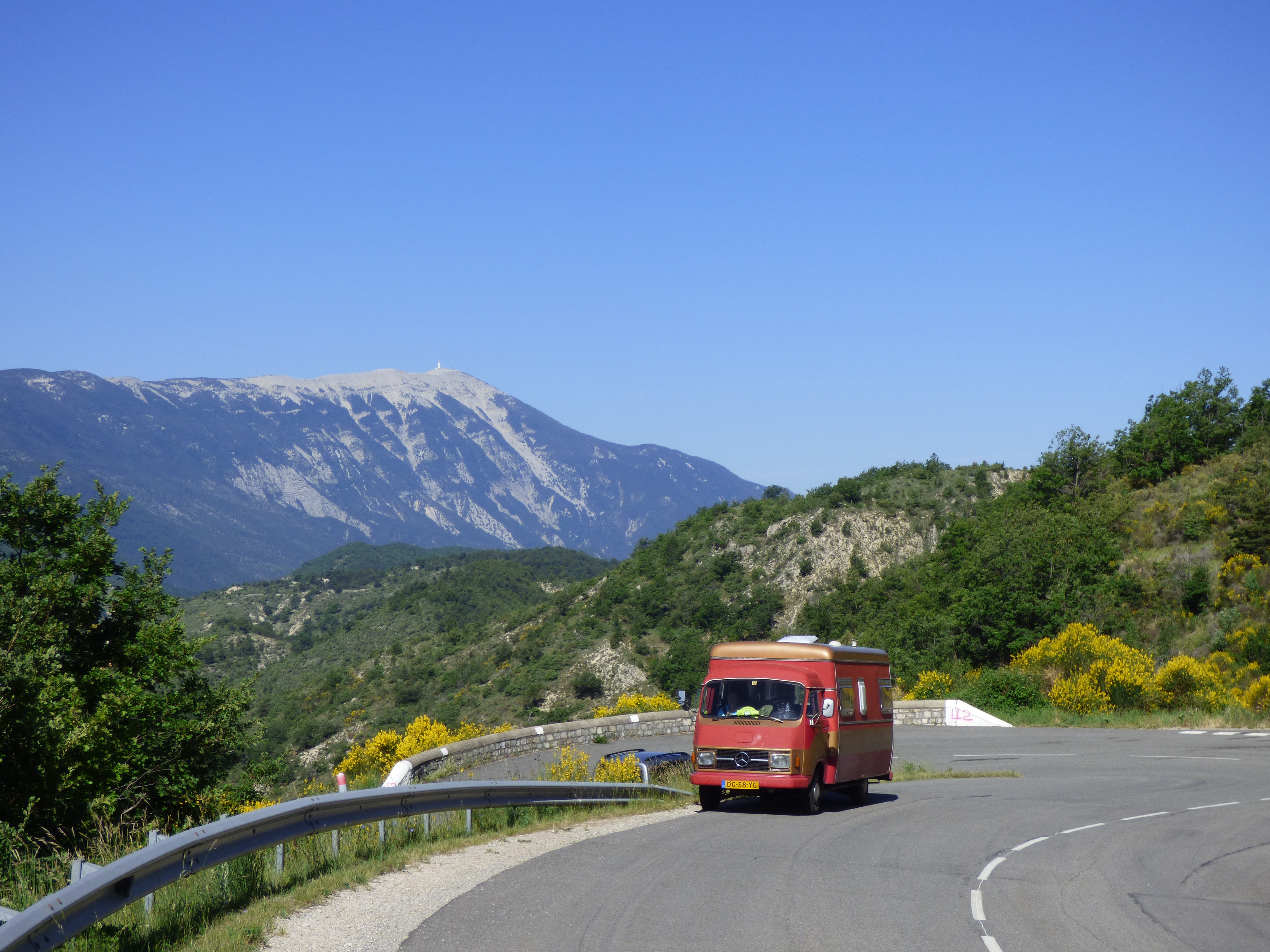 De ‘bus’ heeft zich uitstekend gehouden. Onderweg 1 keer een half litertje olie bijgevuld, en een paar keer wat koelvloeistof aangevuld. Dat laatste is niet meer dan normaal bij een motor met een niet-gesloten koelsysteem. De motortemperatuur is niet boven de 90 graden geweest, ook niet bij de hoogste of steilste bergpassen (15 procent stijging was dit keer de steilste). Die laatste moest even in z'n één, de rest ging op z'n dooie akkertje in de twee, heel soms de drie. En omlaag natuurlijk weer dezelfde versnelling aanhouden om zoveel mogelijk op de motor te remmen. Omdat je dan meestal toch niet op doorgaande wegen rijdt, zit je niemand in de weg. En zo nodig even uitwijken, als daar gelegenheid voor is. En het verbruik blijft zo rond de 1 op 10 schommelen (totaal gemiddeld nu 1 op 10,24 ( 9,77 l/100km).