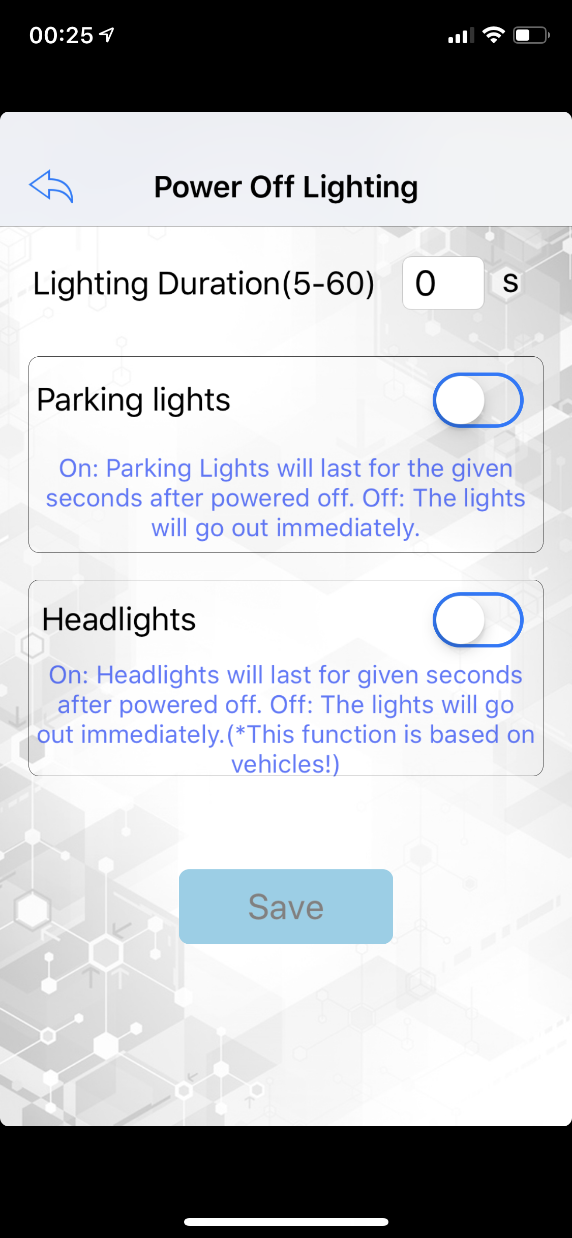 Power off lightning: Eigenlijk de coming home functie. Hier stel je in hoeveel seconden de lichten moeten blijven branden als je op de plek van bestemming bent aangekomen, nadat je het contact uit hebt gezet. Je kunt kiezen of je dit via het dimlicht of het stadslicht wilt activeren, of zelfs beide. Mistlichten is helaas niet mogelijk.