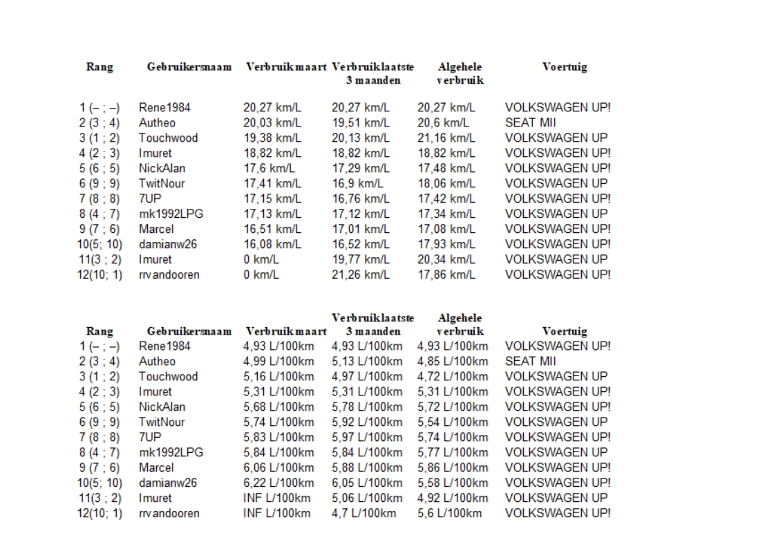 Om eerlijk te zijn denk ik dat jij vergeleken met de top 3 in verhouding nog wel eens minstens net zo zuinig of zelfs zuiniger rijdt dan nu lijkt. Want jouw liters gaan dacht ik over LPG, en daar wordt van gezegd dat door de lagere verbrandingswaarde je tussen 10 en 15% meerverbruik hebt. Als je jouw verbruikscijfers daarmee corrigeert, kom je deze maand tussen de 5,1 en 5,3 l/100 km of tussen 1 op 20,1en 19,0 km, als ik me niet verreken.
