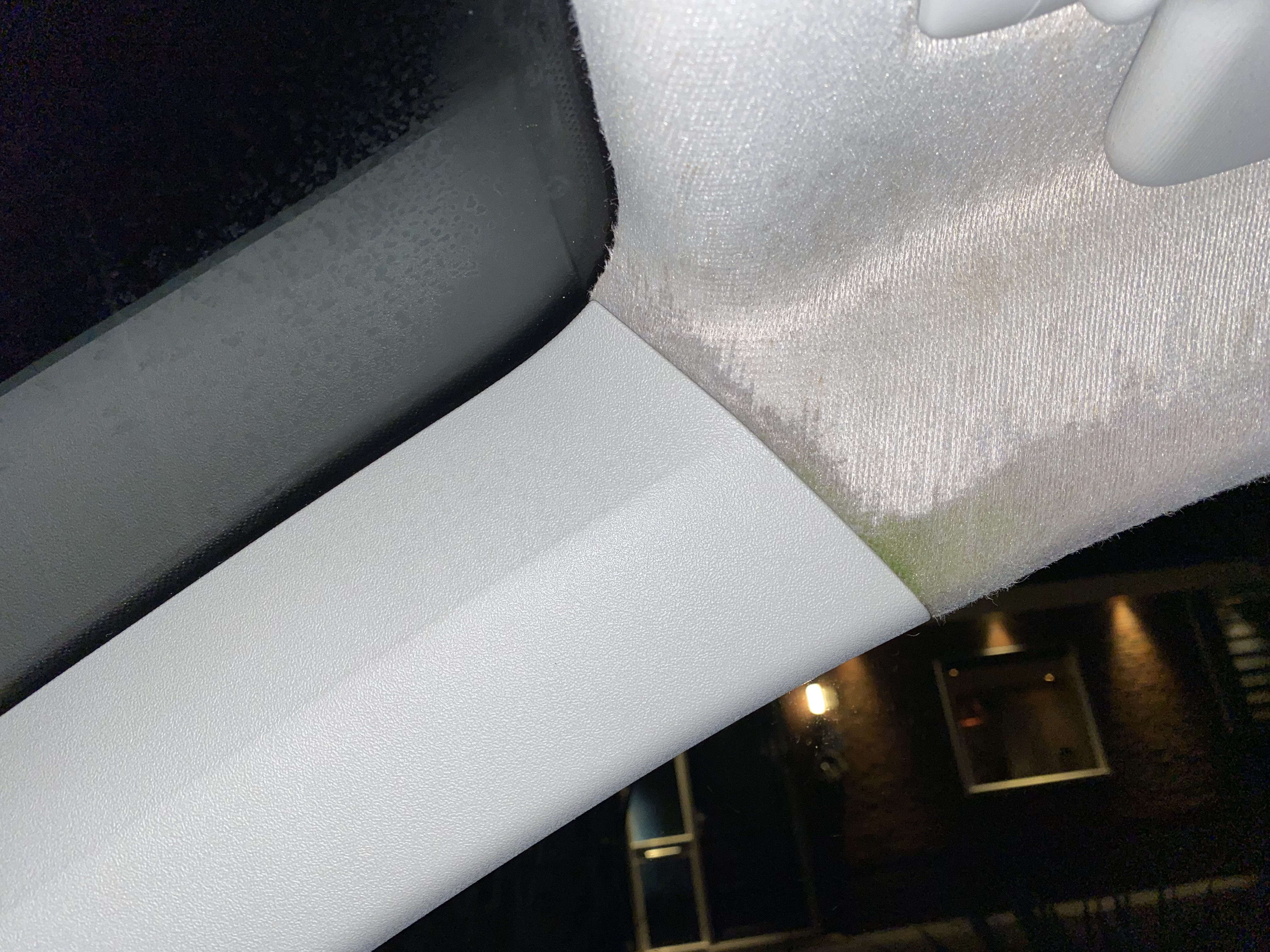 Mijn vrouw rijdt in een Seat Mii van 2012 (met panorama dak) en aan de bijrijders zijde waar de dak hemel overgaat naar de kunststof A stijl kap, zit er klaarblijkelijk al een poosje een behoorlijke vochtplek in het stof van het plafond.