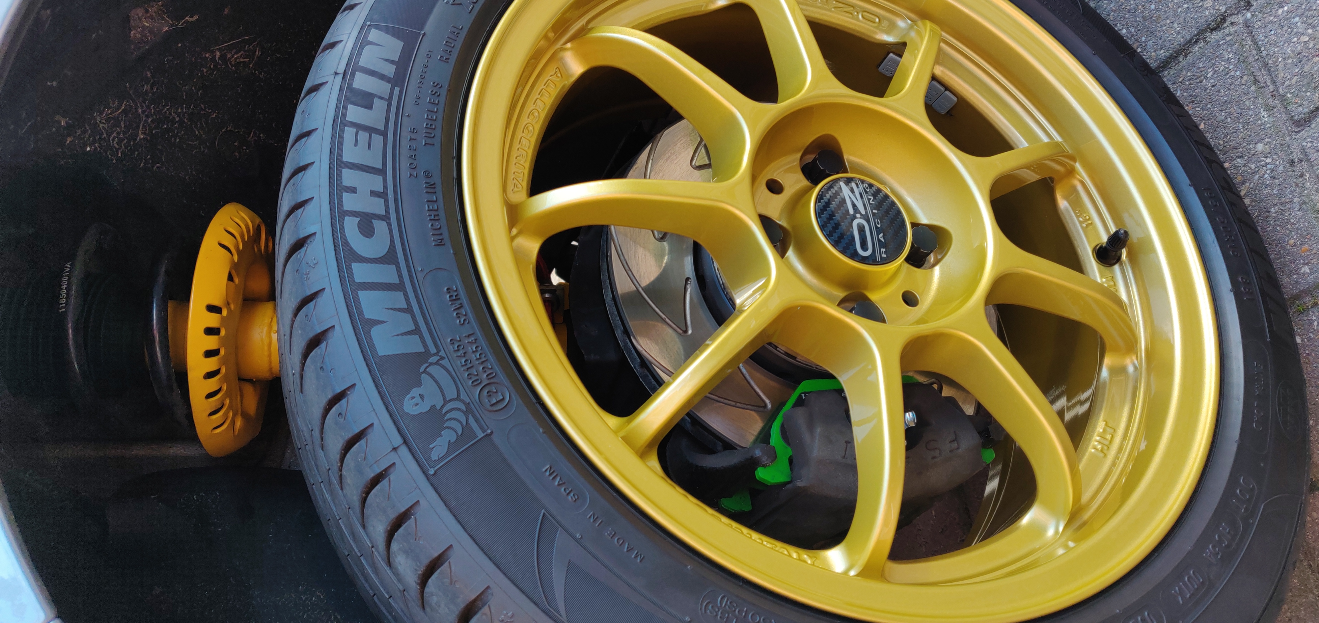 +OZ-RACING Alleggerita HLT in race gold 7x16 ET 37 met nog goede Michelin primacy 3 195/50 (5a6 mm profiel) +20 Jr-wheels slotbouten met adapter (dit is alleen al bijna €2000,- )