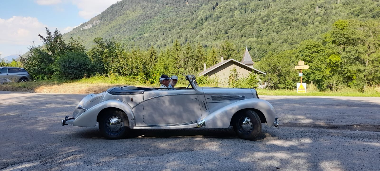 In de Alpen een leuke ontmoeting gehad met een klassiekerclub, die er een dag samen op uittrokken. Ik raakte aan de praat met de eigenaar van een klassieker, waarvan ik nog nooit gehoord had: een Salmson S4 E uit 1951. Salmson was een fabriek, die al voor de tweede wereldoorlog pompen, vliegtuigen en auto’s maakte. De Salmson S4 E was een ontwerp van eind dertiger jaren, waarvan na de tweede wereldoorlog de bouw weer is voortgezet. Ze werden met de hand gemaakt, vooral met RHD. De motor was toen al een speciale constructie, en schakelen ging niet mechanisch, maar elektrisch. Je kon zelfs elektrisch schakelen zonder te hoeven ontkoppelen, maar omdat dat niet altijd helemaal soepel ging (met name in de bergen), was er zo nodig ook een koppelingspedaal beschikbaar. De auto was nog voorzien van houten schokbrekers, die op wrijving werken. Toen de eigenaar vroeg of ik een rondje mee wilde rijden, was dat natuurlijk niet tegen dovemansoren gezegd.