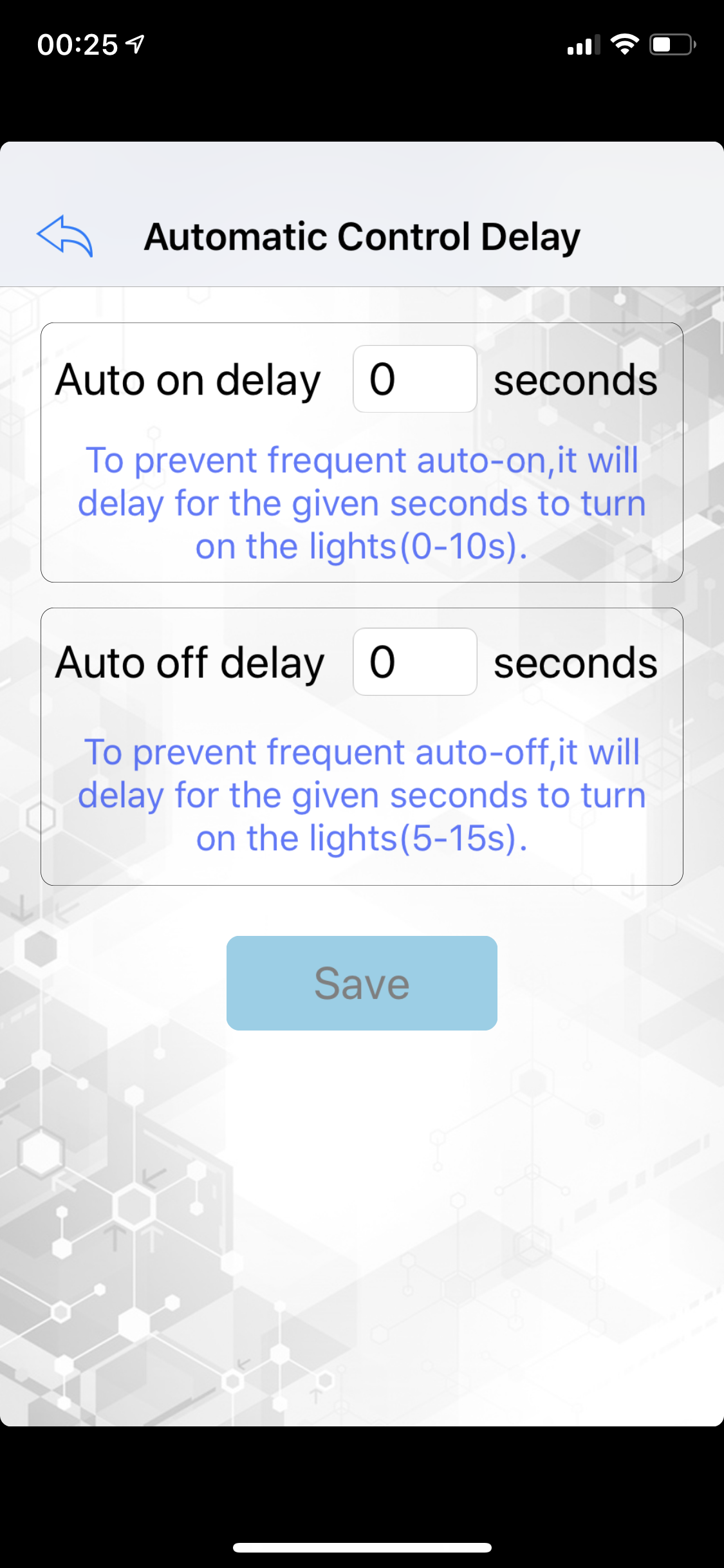 Automatic control delay: Hier kun je de vertraging instellen om de lichten aan te zetten wanneer het donker wordt, en andersom; het uitzetten wanneer het weer lichter wordt. Ik heb hem op 0 seconden en 6 seconden staan.