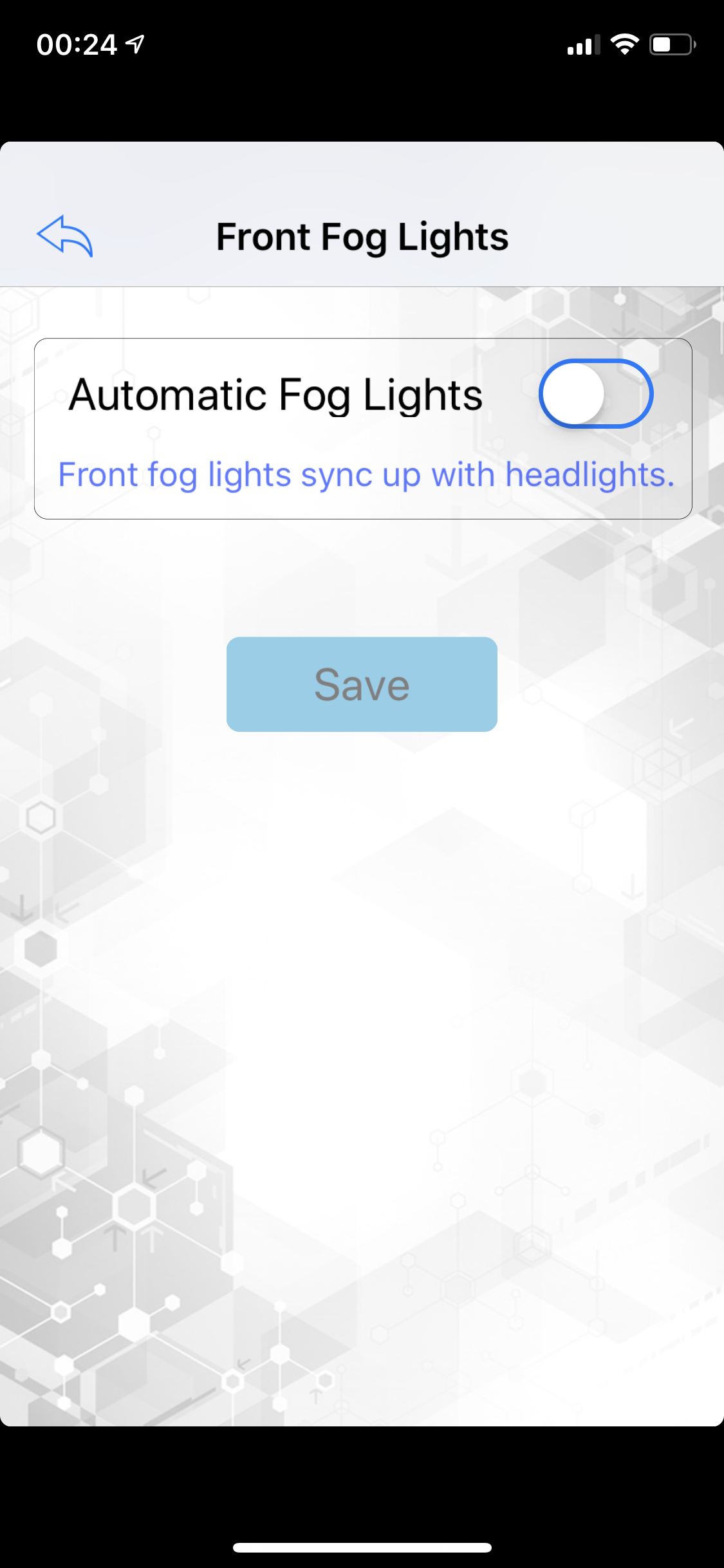 Front fog lights: Als je deze functie aanzet, gaan je mistlampen voor automatisch mee aan zodra je dimlicht activeert. Ik heb dit uitstaat. Ik wil niet dat ik constant mijn mistlampen aan heb staan als de verlichting aan gaat.