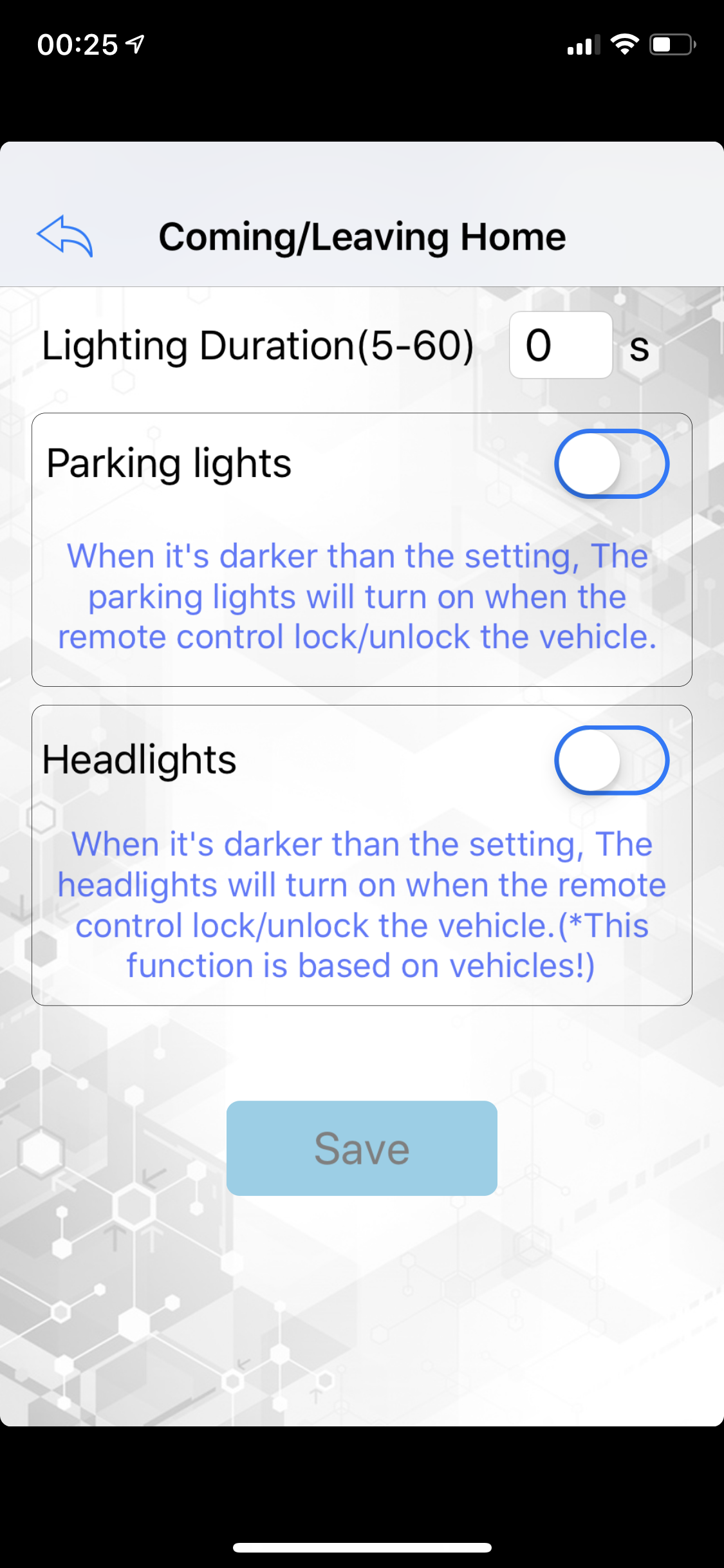 Coming/Leaving home: In feite hetzelfde als de bovenstaande functie, enkel wordt deze geactiveerd door het unlocken of locken van de deuren met de sleutel. Ook hier kun je weer kiezen voor het aantal seconden en de keuze tussen dimlicht en stadslicht of beide.